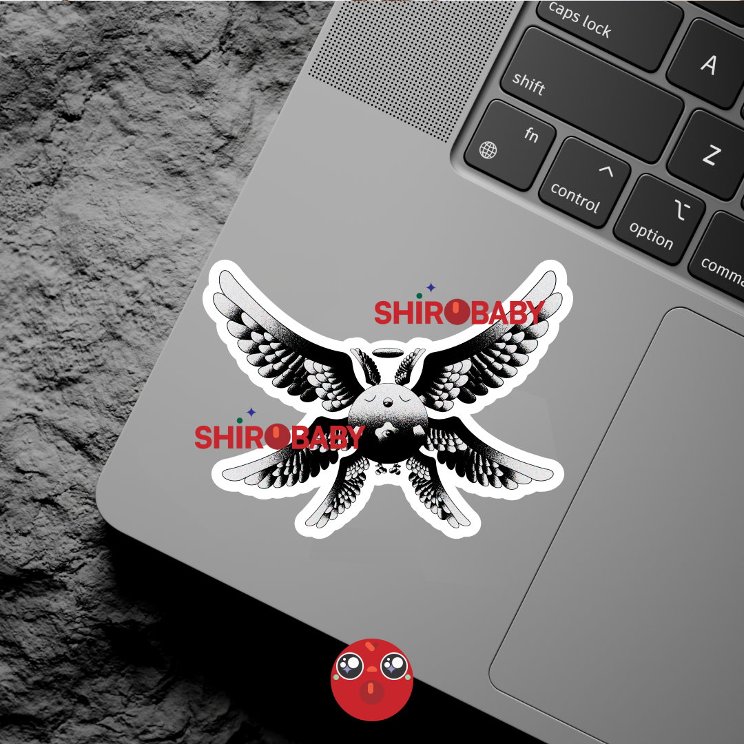 Story - Shirobaby, glowing softly, rises above the clouds — not with wings, but with wonder. The sky parts gently as if it’s always known them, and stars blink in quiet applause. An angel? Maybe. But definitely something even softer.